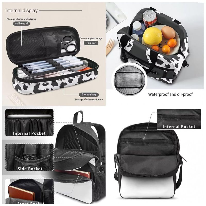 Conjunto escolar com quatro peças composto por mochila de aproximadamente 43 cm de altura (17"), lancheira, bolsa tiracolo compacta e estojo, indicado para crianças a partir de 7 anos, adolescentes e adultos em rotinas escolares e de lazer. A mochila principal em poliéster leve e resistente a arranhões conta com compartimento interno com bolso para caderno ou dispositivo, bolso frontal para itens de acesso rápido, bolsos laterais para garrafa de água e guarda-chuva, além de fechamento em zíper de curso suave.