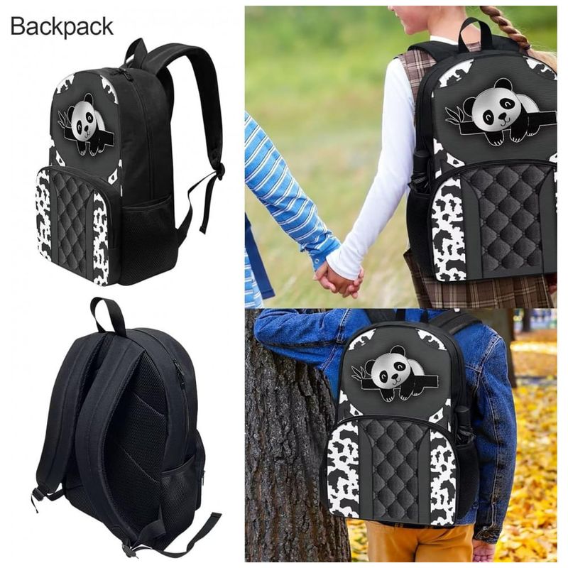 Modelo: Conjunto mochila escolar 4 peças prata com estampa de pandas