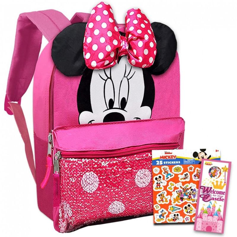 Mochila Disney Minnie Mouse para meninas e bebês Mochila Minnie pré escolar de luxo de com orelhas, laço e lantejoulas reversíveis mágicas e adesivos material escolar Minnie Mouse.