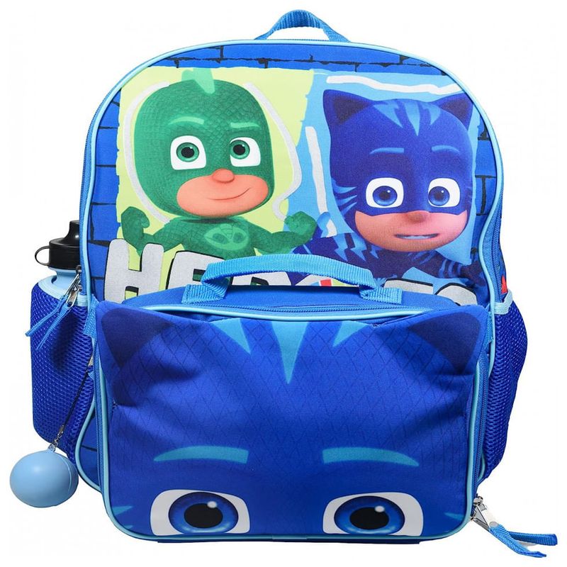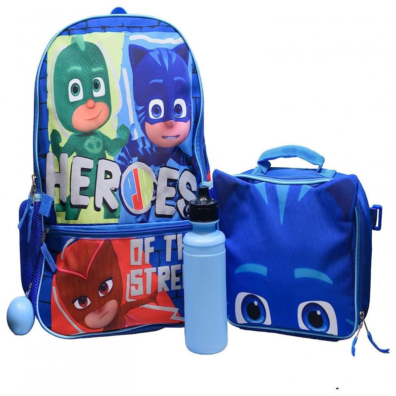 CONJUNTO DE MOCHILA DE 4 PEÇAS PJ MASKS PARA CRIANÇAS Este conjunto de mochila PJ Masks é essencial para VOLTAR À ESCOLA. O conjunto inclui uma mochila de com bolso frontal com zíper e apresenta todos os três PJ Mask Super Heroes Catboy, Gekko e Owlettte, uma lancheira 3D Cat Boy destacável, uma garrafa de água e uma bola de inquietação mole.