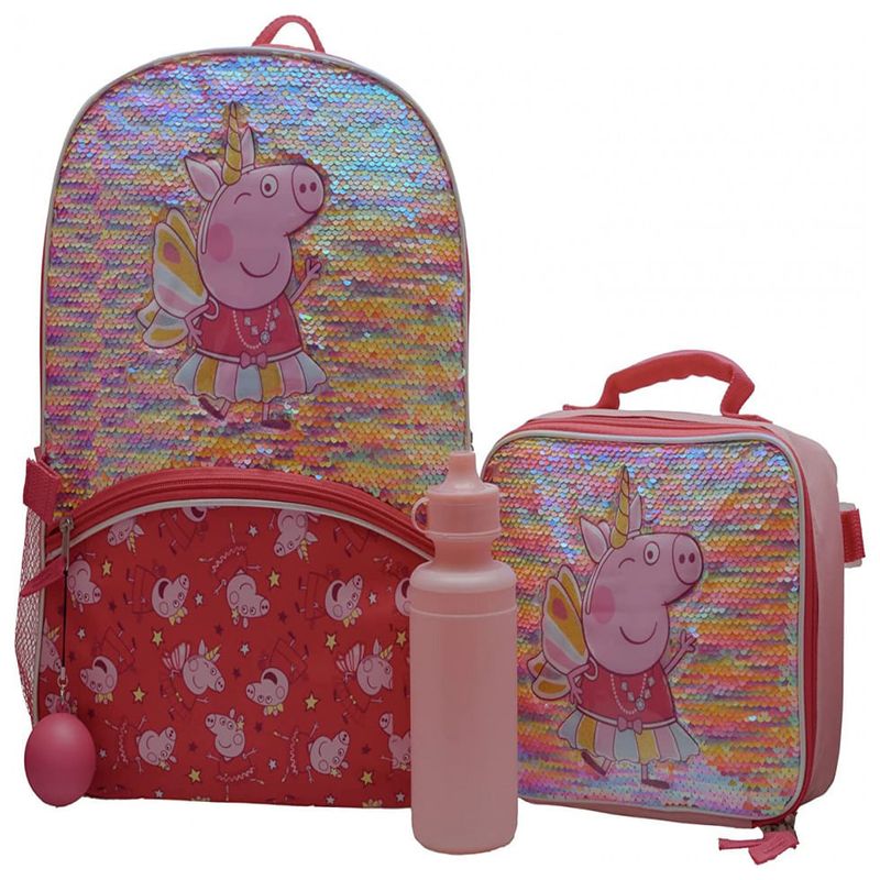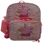DETALHES A mochila e a lancheira apresentam remendos de Peppa com apliques de PVC vestidos com sua roupa de princesa de fadas sem milho e material de lantejoulas de mudança de cor iridescente brilhante que alterna das cores do arco íris pastel ao branco iridescente quando escovado.