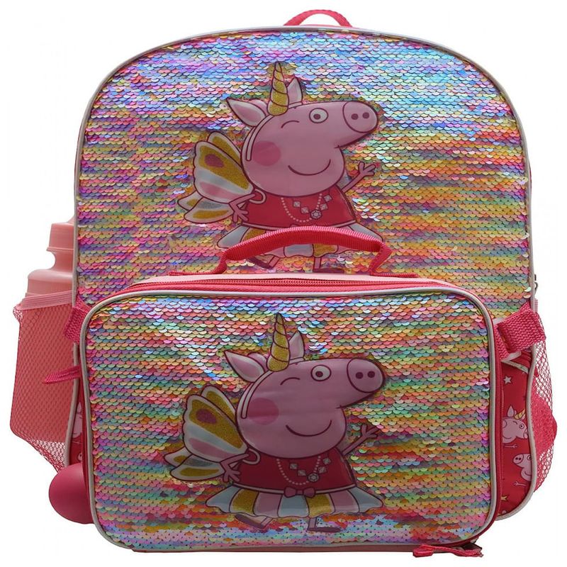 Esta mochila Peppa Pig é essencial para VOLTAR À ESCOLA. O conjunto inclui uma mochila Peppa de 16 polegadas com bolso frontal, lancheira destacável, uma garrafa de água e um chaveiro divertido.