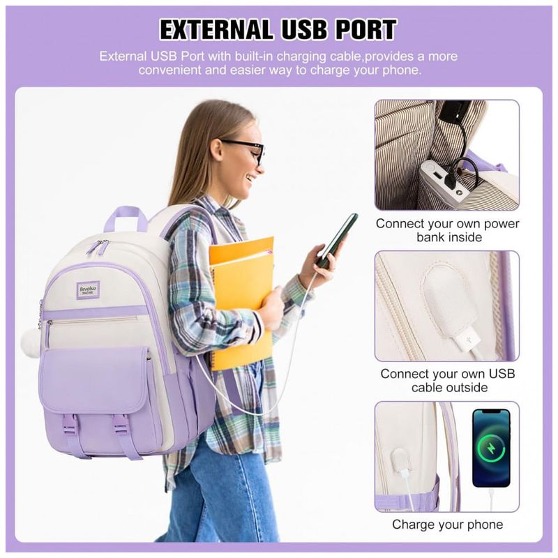Modelo: Mochila escolar juvenil roxa e bege com porta USB