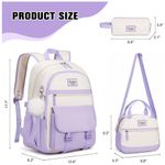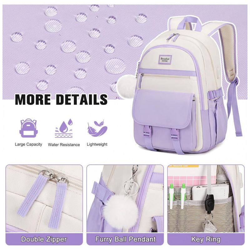 A mochila escolar Bevalsa roxa e bege foi desenvolvida para uso diário de alunas do ensino fundamental ao universitário, com estrutura para notebook de até 39,6 cm e múltiplos compartimentos para organização de livros, cadernos e acessórios. O conjunto inclui mochila, lancheira com alça tiracolo ajustável e estojo/necessaire, formando um kit 3 em 1 para estudo, trabalho ou viagens curtas.