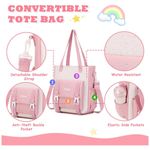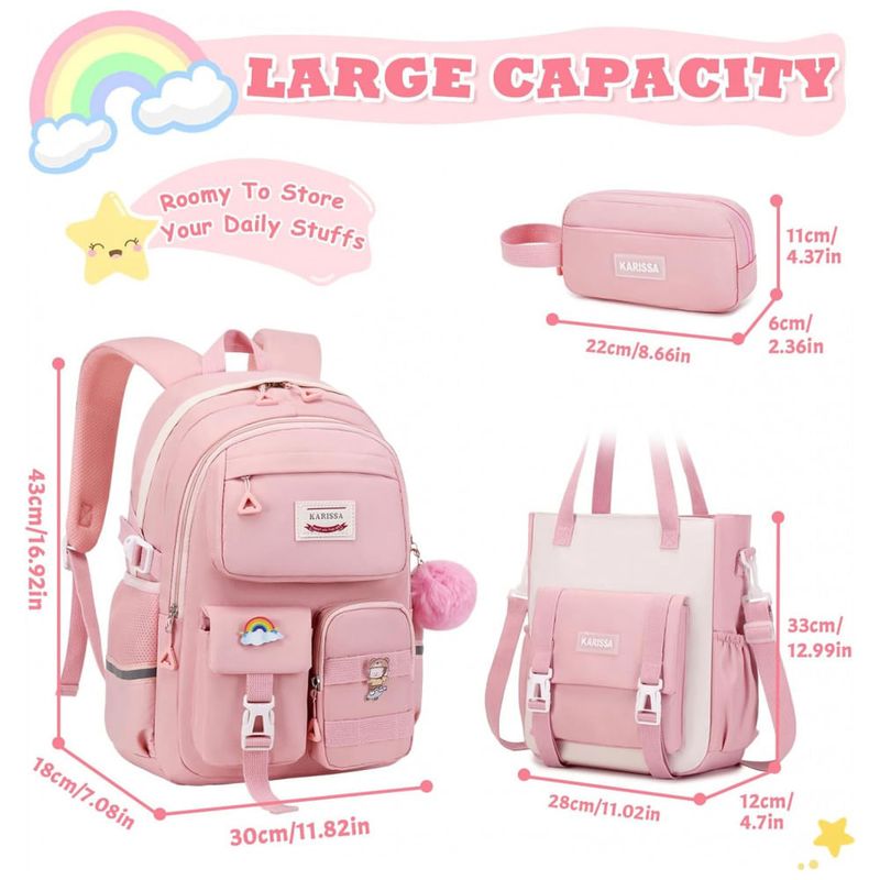 Conjunto escolar 3 em 1 composto por mochila, bolsa tiracolo conversível e estojo, indicado para meninas em idade escolar do ensino fundamental ao médio e uso diário. A mochila tem aproximadamente 43 cm de altura, 18 cm de profundidade e 30 cm de largura, com estrutura de múltiplos compartimentos que comporta notebook de até 15", tablet, fichários em formato A4, livros, lancheira e itens pessoais, além de bolso frontal com zíper, dois bolsos frontais menores com fechamento mais discreto e dois bolsos laterais para garrafa ou guarda-chuva.