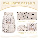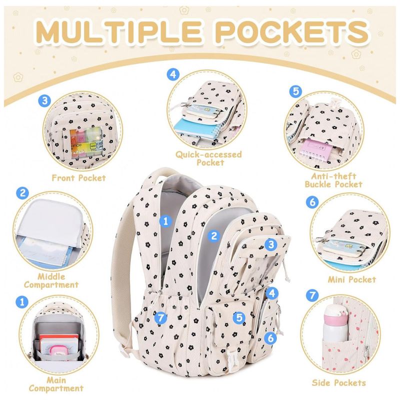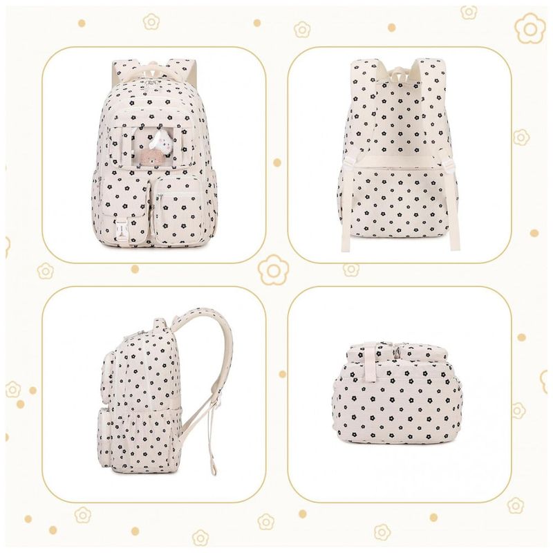 Na parte frontal, o bolso transparente em estilo ita bag permite exibir pins e acessórios, complementado por três bolsos menores para pequenos objetos de acesso rápido, além de bolsos laterais com elástico para garrafa de água e guarda-chuva. O corpo da mochila é confeccionado em veludo cotelê macio, leve e espesso, com costuras reforçadas e zíperes de abertura suave, adequado ao uso frequente em ambiente escolar e passeios. As alças acolchoadas com espuma espessa seguem desenho ergonômico para reduzir a pressão nos ombros, e o painel traseiro respirável contribui para maior conforto durante o uso contínuo.