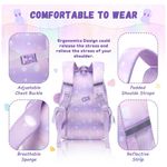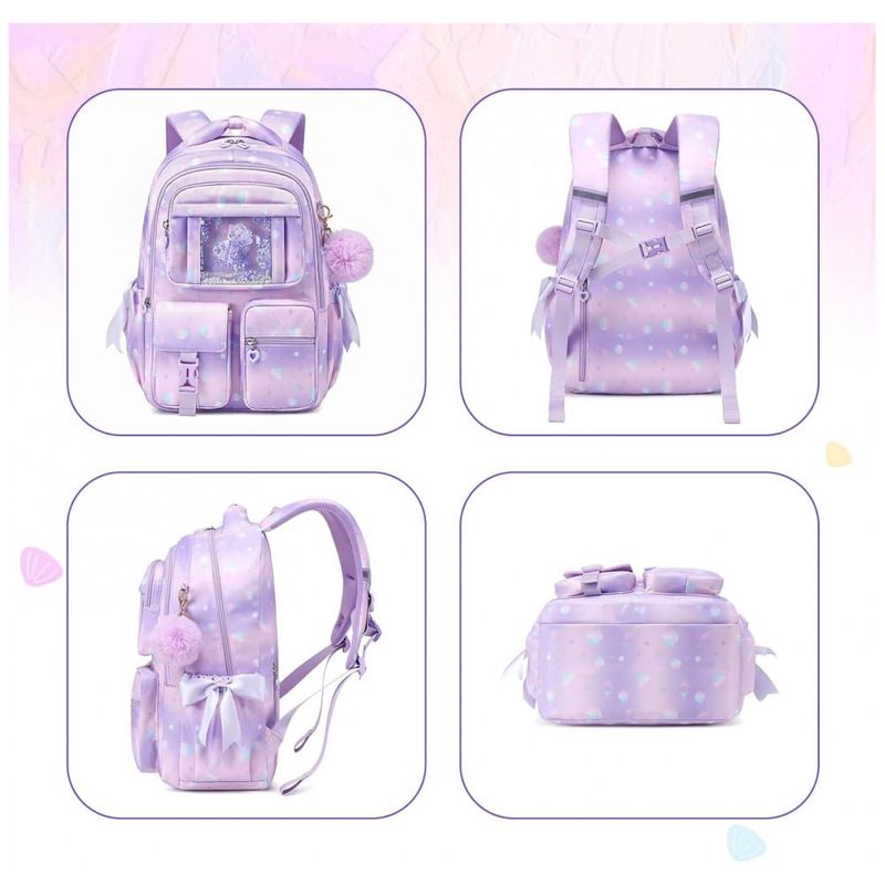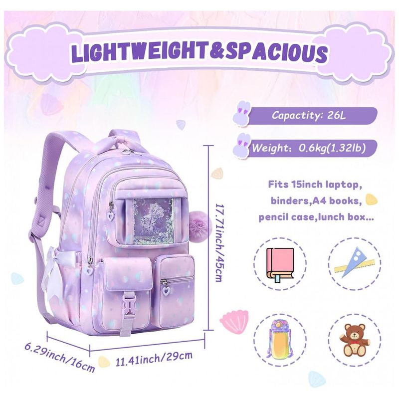 Na parte frontal, o bolso transparente superior permite exibir pins e pequenos acessórios, complementado por três bolsos menores para objetos de acesso rápido, enquanto os bolsos laterais com elástico acomodam garrafa de água e guarda-chuva compacto. A estrutura é produzida em poliéster espesso resistente à água e rasgos, com costuras reforçadas e zíperes de abertura suave, adequada ao uso frequente em ambiente escolar, passeios e viagens curtas. As alças de ombro acolchoadas com espuma e o painel traseiro respirável seguem desenho ergonômico para melhor distribuição do peso, contando ainda com faixa refletiva que auxilia na visibilidade em condições de baixa luminosidade.