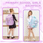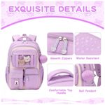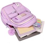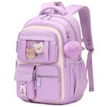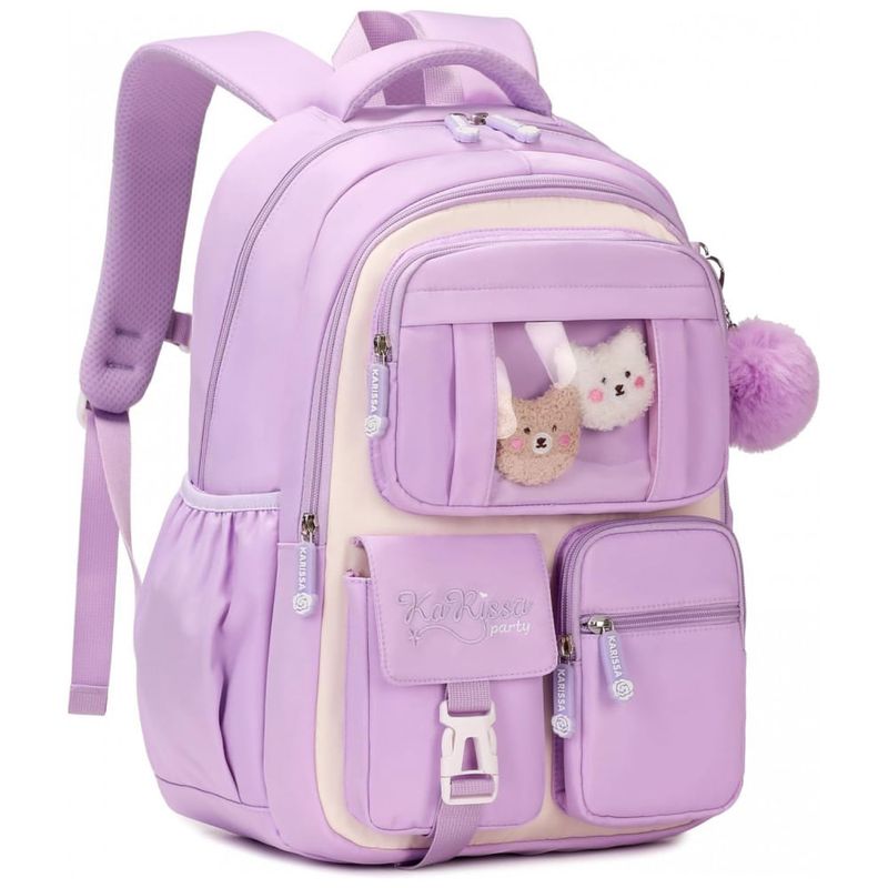 Mochila escolar infantil em tons de roxo e bege, com bolso frontal transparente em estilo ita bag, indicada para meninas de aproximadamente 6 a 14 anos em fase de ensino fundamental. Com cerca de 29 cm de largura, 16 cm de profundidade e 45 cm de altura, a mochila dispõe de compartimento principal com sleeve para notebook de até 15", espaço para fichários A4, livros didáticos e lancheira, além de um segundo bolso frontal voltado para cadernos, estojo e materiais de uso diário.