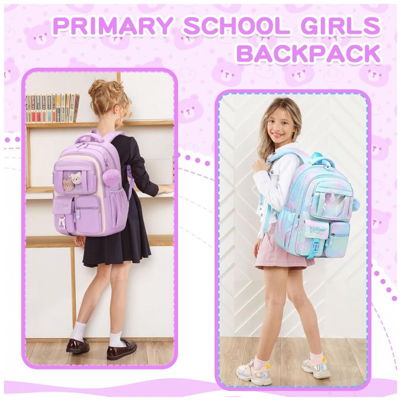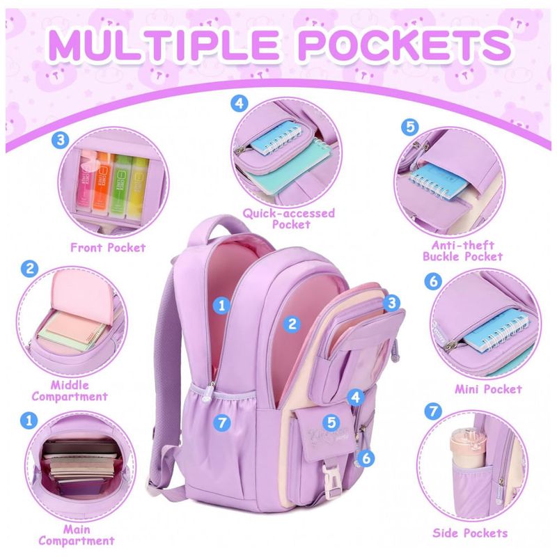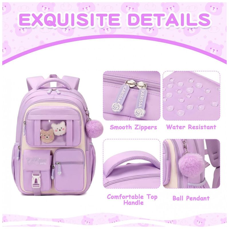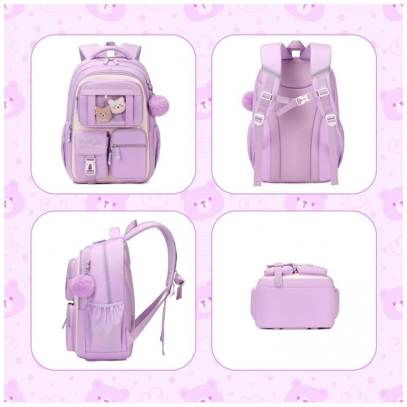 Na parte frontal, o bolso transparente superior permite exibir pins e pequenos acessórios, acompanhado de três bolsos menores para objetos de acesso rápido, enquanto os bolsos laterais com elástico comportam garrafas de água e guarda-chuva compacto. A estrutura é produzida em poliéster espesso resistente à água e rasgos, com costuras reforçadas e zíperes de abertura suave, adequada ao uso frequente em ambiente escolar, passeios e viagens curtas. As alças de ombro acolchoadas com espuma e o painel traseiro respirável seguem desenho ergonômico para melhor distribuição do peso, contando ainda com faixa refletiva que auxilia na visibilidade em condições de baixa luminosidade.