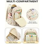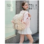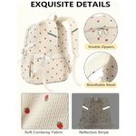 As alças de ombro acolchoadas com espuma espessa são ajustáveis e projetadas para maior conforto, enquanto as tiras refletivas aumentam a visibilidade em ambientes de baixa luminosidade. O bolso traseiro antirroubo com zíper protege documentos e itens de valor, e a cinta traseira permite acoplar a mochila ao puxador da mala em viagens, mantendo o visual juvenil em corduroy bege com estampa de morangos.