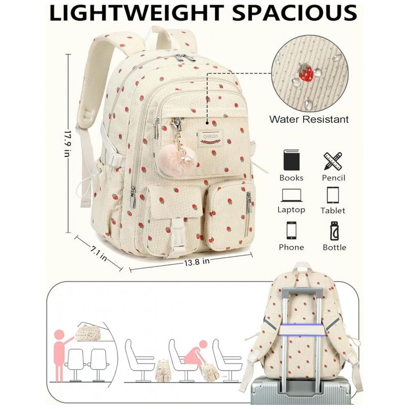 Conteúdo da caixa: 1 mochila QHRIDS corduroy bege com estampa de morangos