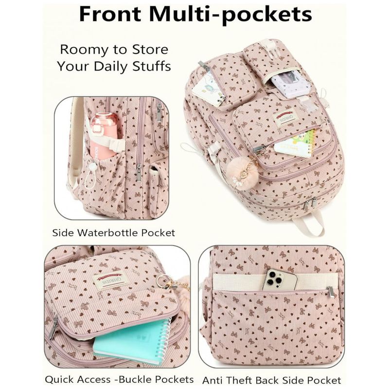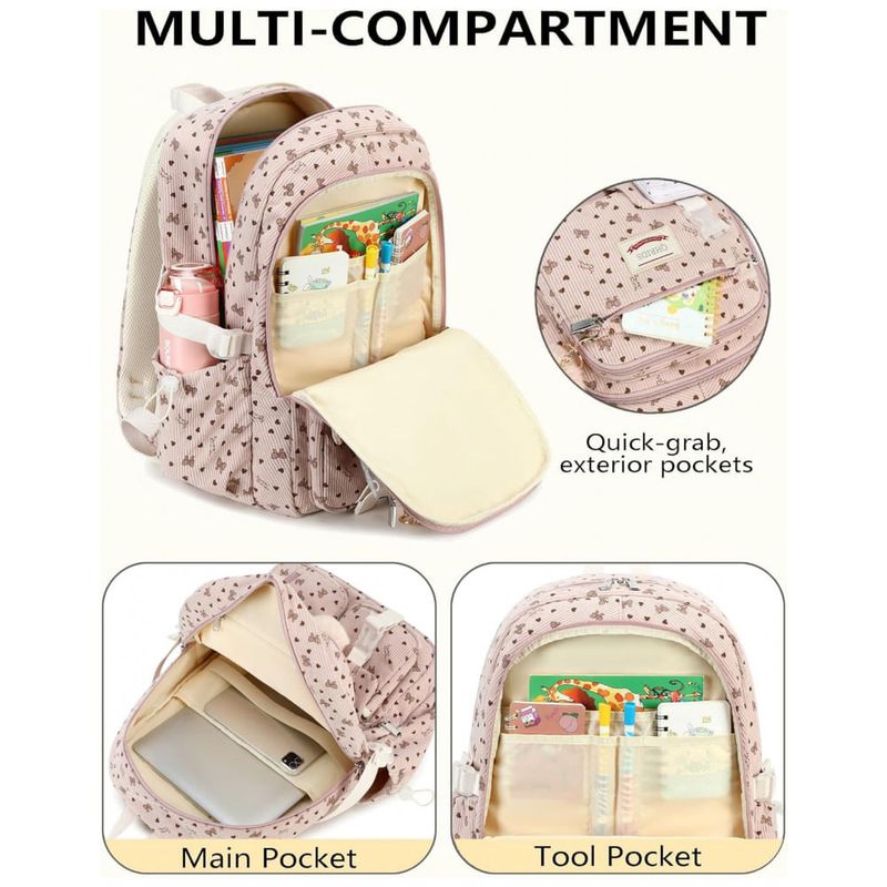 Mochila escolar QHRIDS em tecido cotelê (corduroy) macio de alta densidade, indicada para alunas de ensino fundamental, médio, faculdade e uso diário. O corpo da mochila oferece sete compartimentos em diferentes tamanhos, incluindo três bolsos com zíper para notebook de até 38 cm, tablet, livros e cadernos, dois bolsos frontais para itens de acesso rápido e dois bolsos laterais com elástico para garrafas ou guarda-chuva.