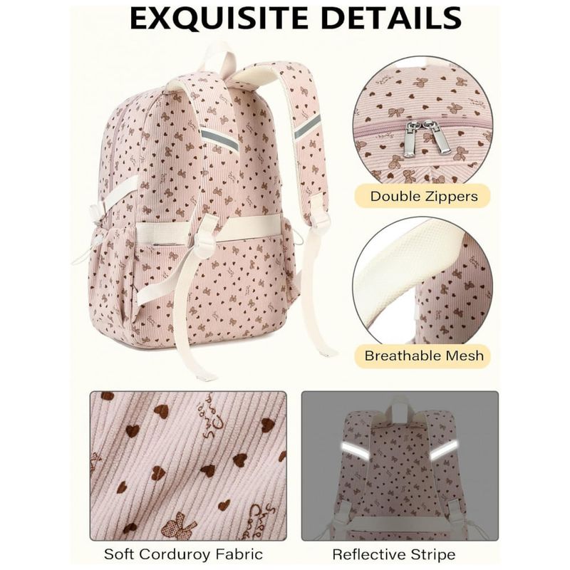 As alças de ombro são acolchoadas com espuma espessa e ajustáveis, contribuindo para maior conforto em trajetos mais longos, enquanto o encosto conta com tira de fixação para acoplar em malas de viagem e bolso traseiro antirroubo para documentos e itens de valor. A presença de detalhes refletivos melhora a visibilidade em deslocamentos noturnos, mantendo o visual juvenil em corduroy rosa com laço decorativo.