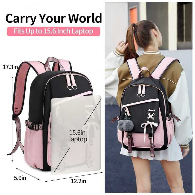 O design ergonômico conta com alças ajustáveis acolchoadas que ajudam a aliviar a pressão nos ombros e costas, além de painel traseiro com material respirável para maior conforto em uso prolongado. O tecido é resistente à água e ao desgaste, adequado ao uso frequente, com visual em estilo anime/kawaii, laços decorativos e pompom de pelúcia que deixam a mochila mais divertida para uso escolar e urbano.