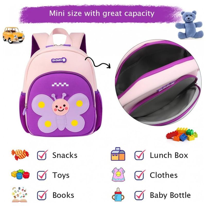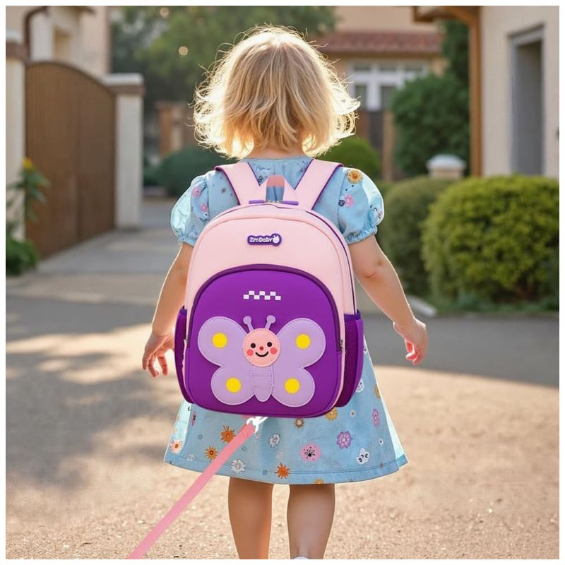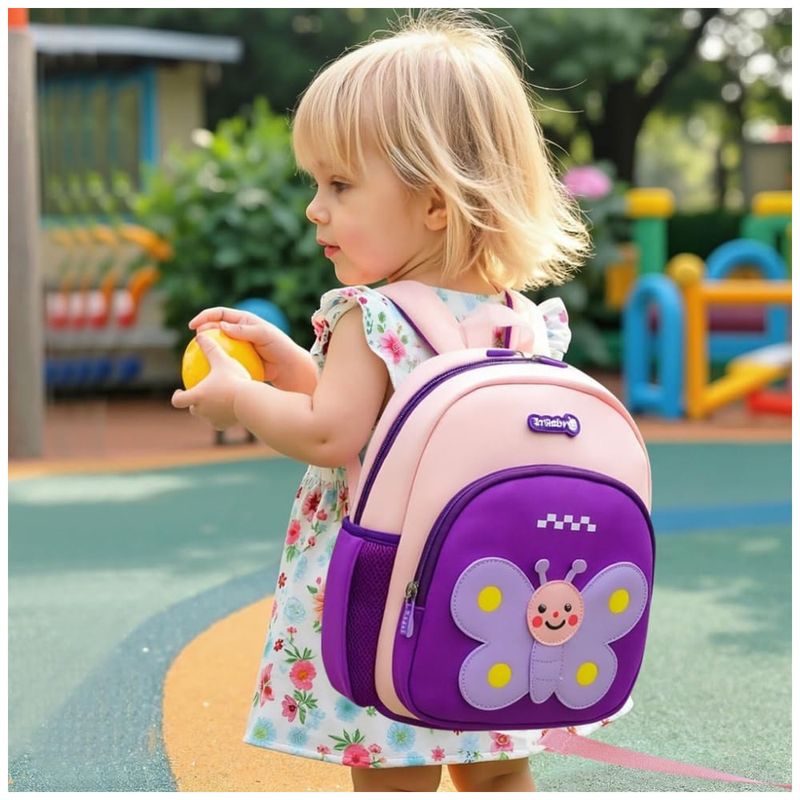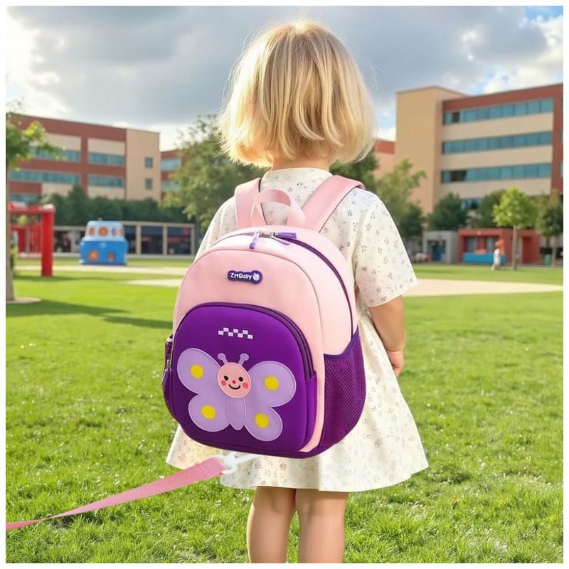 A mochila infantil Padgene com personagem de borboleta 3D foi desenvolvida para crianças de 3 a 5 anos, unindo formato mini, material leve e função de segurança com alça-guia destacável para uso em passeios, creche e pré-escola. O corpo em material tipo neoprene/SBR impermeável é ultraleve e fácil de limpar, adequado para uso diário por crianças pequenas.