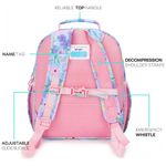O corpo em poliéster resistente à água com costuras reforçadas aumenta a durabilidade, e o zíper YKK suave facilita o manuseio por crianças pequenas. As alças acolchoadas e espessas ajudam a reduzir a pressão nos ombros, com painel traseiro respirável, etiqueta interna para nome e fecho peitoral com apito que pode atuar como recurso lúdico e sinal de alerta.