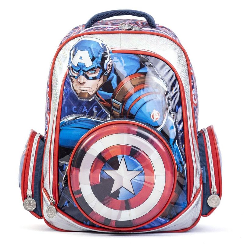 Capitão América sabe o que o seu pequeno precisa para carregar tudo no dia a dia escolar: muito espaço na mochila. O grande espaço interno, com dois compartimentos e três bolsos - dois laterais e um frontal, da mochila Marvel Capitão América são perfeitos para guardar absolutamente tudo que os pequenos necessitam na rotina. Seu acabamento com material especial prata traz a temática do filme para a hora do estudo.