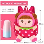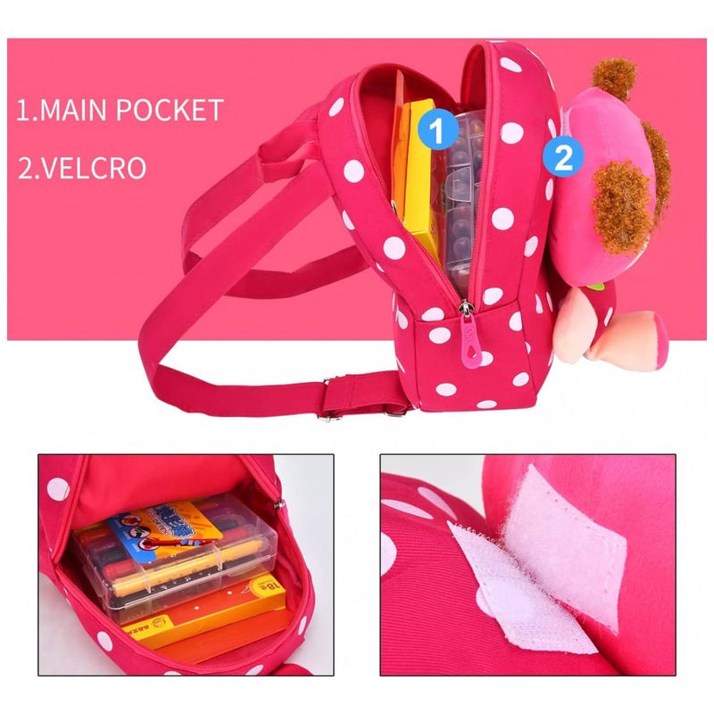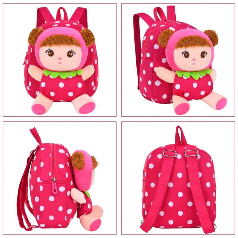 As alças de ombro ajustáveis permitem regular o comprimento para melhor encaixe nas costas da criança, enquanto o formato leve favorece o uso por períodos curtos. A boneca de pelúcia acoplada à frente é destacável, funcionando como brinquedo independente, e o compartimento principal com fechamento em zíper facilita o acesso e a organização dos pertences infantis.
