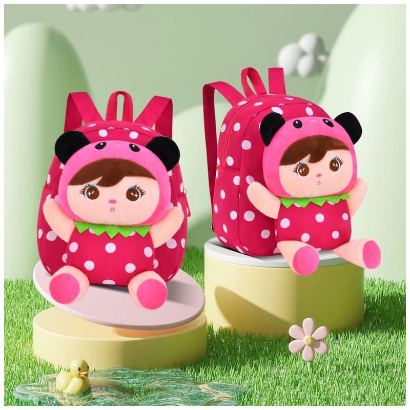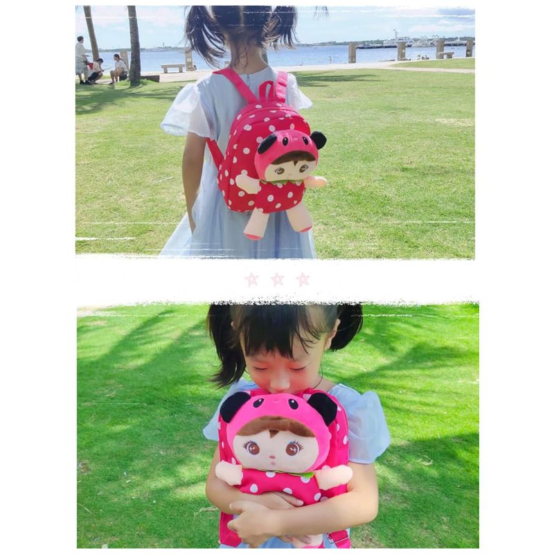 Mochila infantil compacta em lona com boneca de pelúcia na parte frontal, indicada para crianças de aproximadamente 1 a 5 anos para uso em creche, pré-escola, passeios e pequenas viagens. O corpo da mochila utiliza canvas resistente com forro interno macio, oferecendo espaço para lanchinhos, brinquedos pequenos, livros infantis e outros itens de uso diário.
