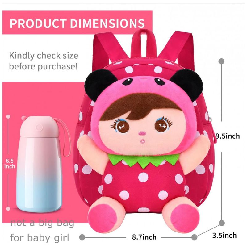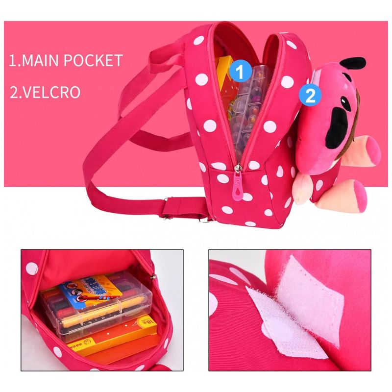 As alças de ombro ajustáveis permitem regular o comprimento conforme a altura da criança, garantindo melhor encaixe nas costas. A pelúcia frontal é destacável, podendo ser usada como brinquedo separado, enquanto o compartimento principal com fechamento em zíper facilita o acesso e a organização dos pertences infantis em deslocamentos.