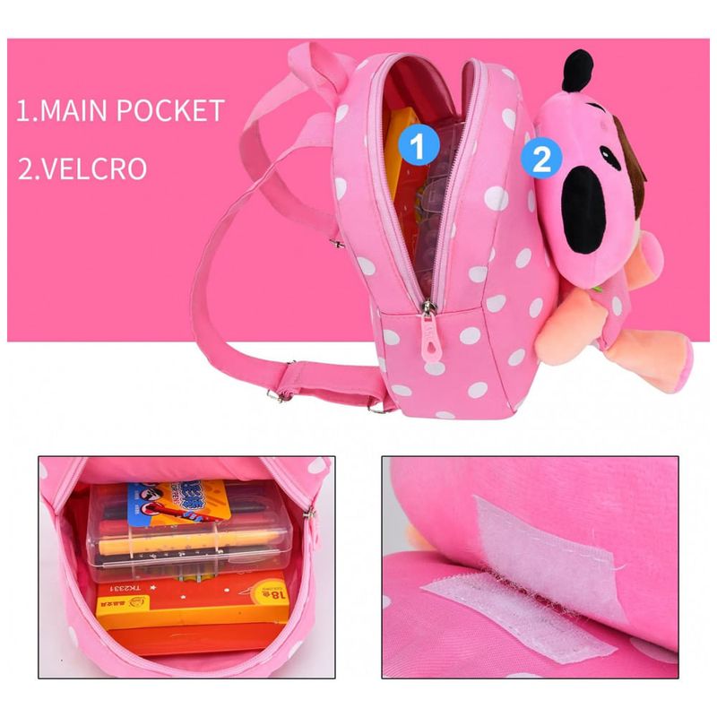 O formato compacto facilita o uso por crianças menores, enquanto as alças de ombro ajustáveis permitem adaptar a altura conforme a criança cresce. A pelúcia frontal é destacável, funcionando como brinquedo independente, e o compartimento principal com fechamento em zíper ajuda a manter o conteúdo organizado durante deslocamentos.