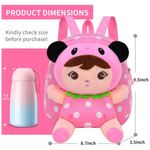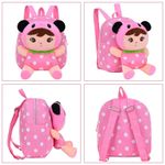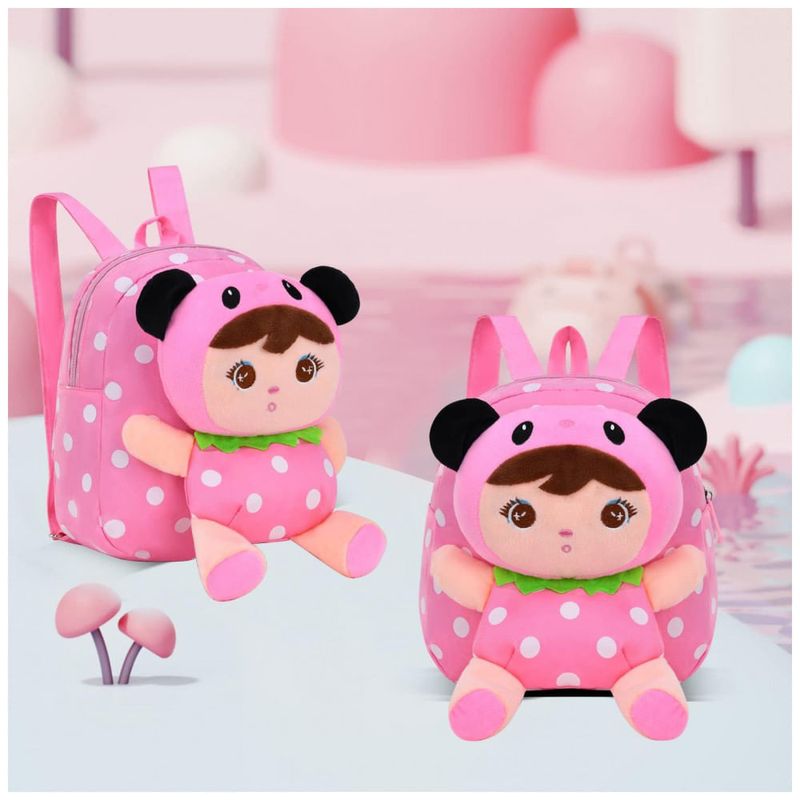 Mochila infantil pequena em lona com boneca de pelúcia fixada na parte frontal, indicada para crianças de aproximadamente 1 a 5 anos para uso em creche, pré-escola, passeios e pequenas viagens. O corpo da mochila utiliza canvas resistente com forro interno macio, oferecendo espaço suficiente para lanchinhos, brinquedos pequenos, livrinhos e outros itens de uso diário da criança.