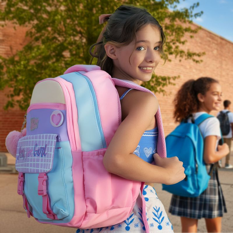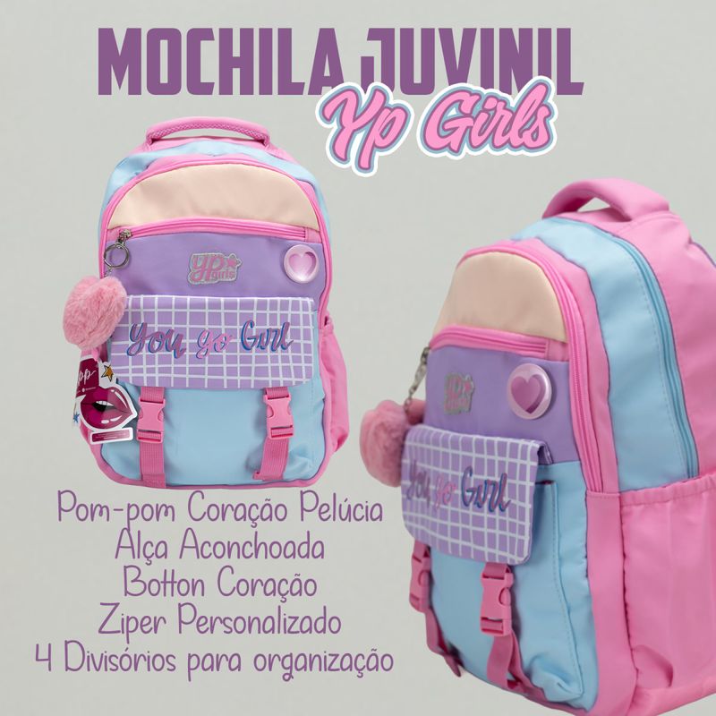 Esta mochila Up Girls da Yepp é a escolha perfeita para jovens que buscam um visual moderno, delicado e cheio de personalidade. Com uma paleta de cores em tons pastéis (azul, rosa e lilás), ela combina funcionalidade com detalhes encantadores que fazem toda a diferença no dia a dia escolar. Aqui está uma descrição detalhada para o seu anúncio: Mochila Juvenil Up Girls Yepp – Estilo e Organização Leve muito mais charme para a escola com a Mochila Up Girls! Desenvolvida em poliéster de alta resistência, ela oferece o equilíbrio ideal entre durabilidade e um design super fashionista. Seu acabamento conta com a frase inspiradora "You Go Girl" em um painel quadriculado que é tendência absoluta. Destaques do Produto: Design Premium: Mix de cores pastéis com detalhes em glitter no logo e puxadores personalizados. Conforto Total: Alças de costas acolchoadas e ajustáveis, além de alça de mão reforçada com tecido respirável. Organização Inteligente: Possui 4 divisórios (compartimentos) com zíper para separar cadernos, estojos e acessórios, além de bolsos laterais para garrafinhas. Acessórios Exclusivos: Acompanha um lindo pom-pom de coração em pelúcia e um botton de coração em relevo. Brinde Especial: Na compra desta mochila, você ganha 1 caneta Pom-Pom exclusiva (personagens sortidos)! Especificações Técnicas: Marca: Yepp Linha: Up Girls Material: 100% Poliéster de alta qualidade. Dimensões: 45 cm (Altura) x 33 cm (Largura) x 15 cm (Profundidade). Cores: Tons de Rosa, Azul Candy e Lilás. Dica: O tamanho de 45 cm é ideal para comportar pastas universitárias, livros grandes e notebook, sendo perfeita para o público juvenil e escolar.
