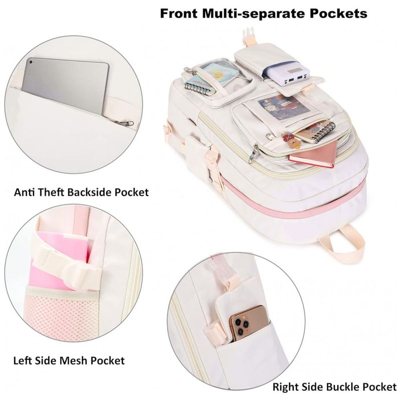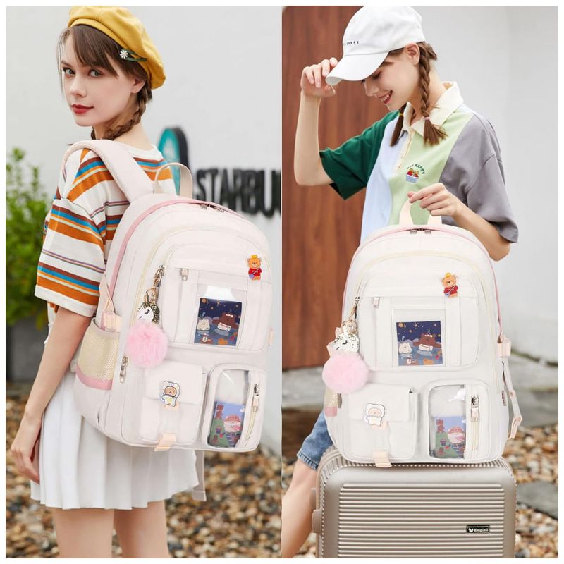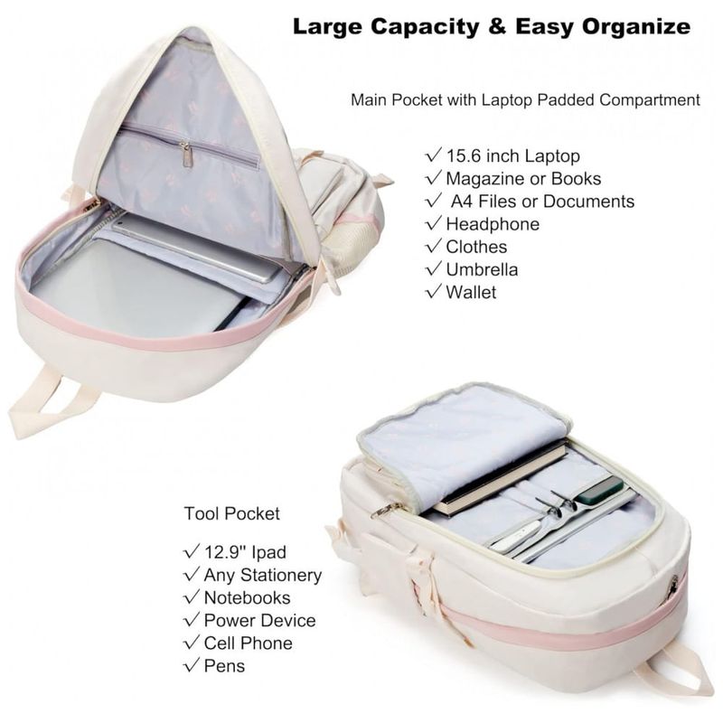 O tecido é impermeável e leve, com zíperes metálicos resistentes que contribuem para o uso frequente em escola, faculdade, trabalho e pequenas viagens. As alças em formato “S” são largas, espessas e ajustáveis, com boa ergonomia para uso prolongado, enquanto a alça de mala na parte traseira permite acoplar a mochila ao carrinho de bagagem em deslocamentos.