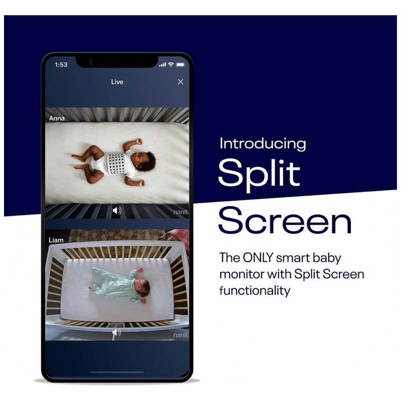 O vídeo HD 1080p permite que você veja o bebê de qualquer lugar usando o aplicativo. Nanit é o ÚNICO monitor inteligente com um recurso de tela dividida que permite aos usuários visualizar duas câmeras em uma tela