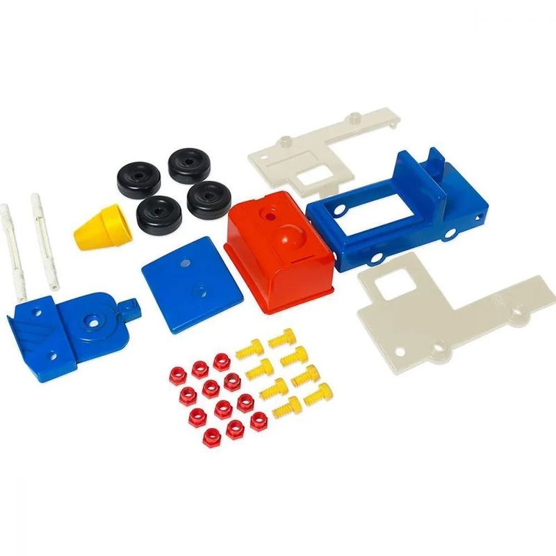 Um trem para a criança montar e desmontar peça por peça quantas vezes desejar, com auxílio de ferramenta, virando um carro de roda livre.