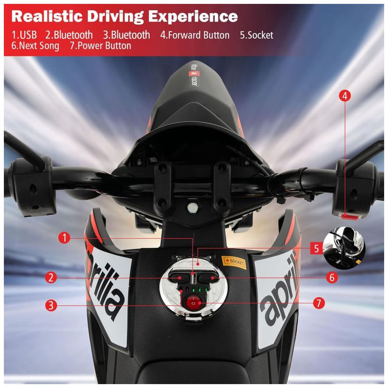 Visual Licenciado e Design Atraente: A motocicleta Aprilia RX125 licenciada oferece um visual autêntico de motocicleta, proporcionando uma experiência de pilotagem real. O design inclui faróis realistas.