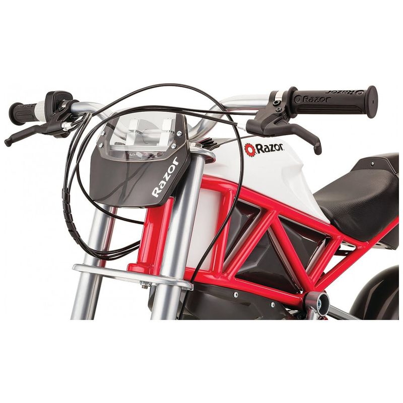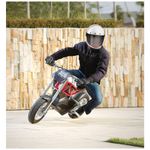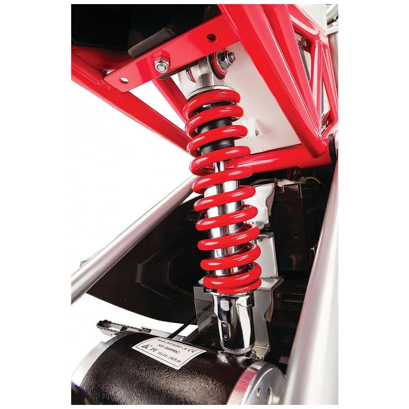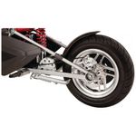 Possui rodas magras personalizadas de e pneus de rua, suspensão traseira, acelerador de aperto de torção de velocidade variável e freios a disco traseiros acionados à mão
