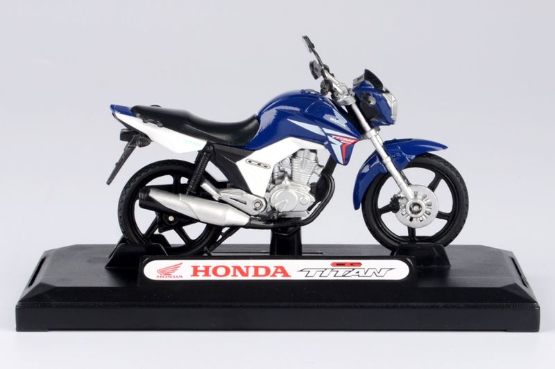 Moto em Miniatura - Honda CG Titan 150 2014Marca do produto: California Toys.Escala: 1/18 (aproximadamente 11 cm de comprimento).Pneus de Borracha. Miniatura em Metal com partes de plástico.Acompanha Base c/ o nome da Miniatura.