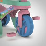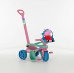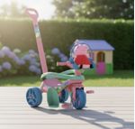 O adulto pode conduzir o triciclo utilizando a haste (não direcionável). A criança pode brincar como em um triciclo convencional, com a opção de remover a haste. Possui apoio para os pés removível que mantém os pés da criança confortavelmente apoiados.