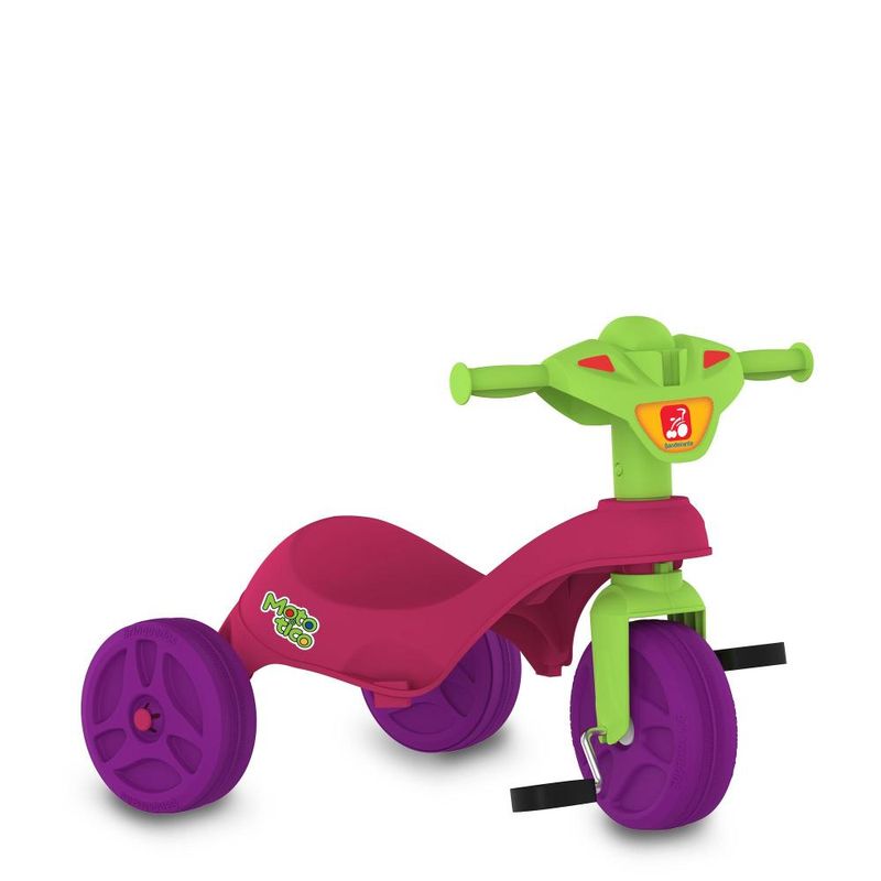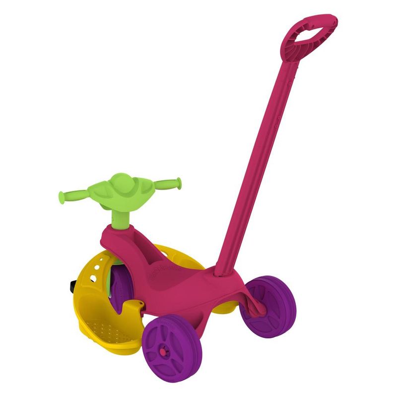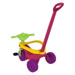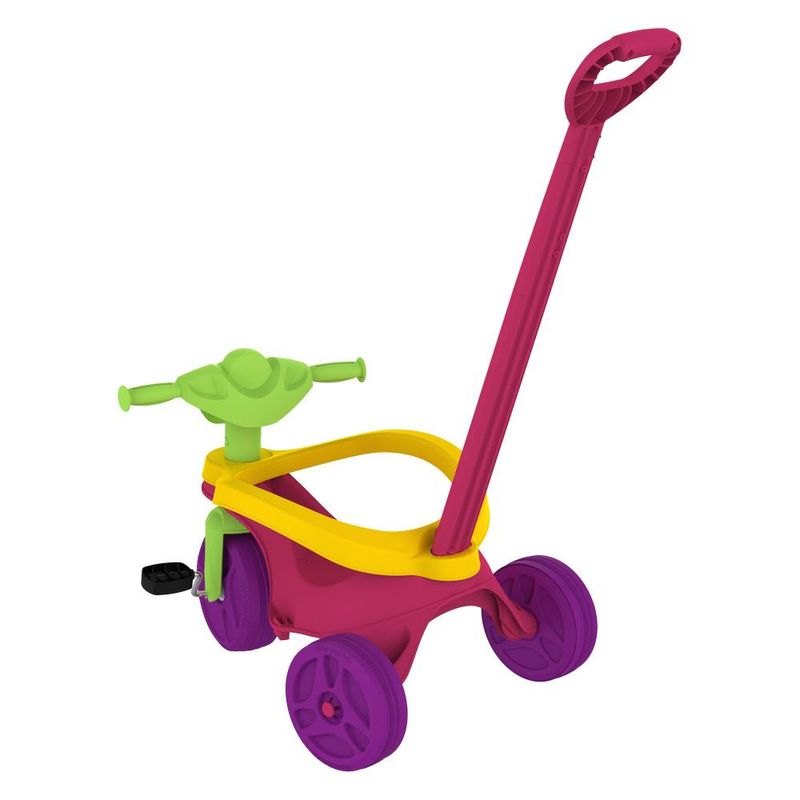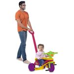 FUNÇÃO PASSEIO: O adulto utiliza a haste (não direcionável) para conduzir o triciclo.FUNÇÃO PEDAL: Permite à criança brincar livremente como um triciclo convencional. Basta remover a haste, o cercado de proteção e o apoio dos pés.Haste removível.