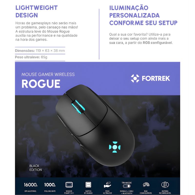 O Fortrek Rogue é um mouse gamer ultraleve desenvolvido para quem exige precisão extrema, resposta rápida e liberdade total de movimentos. Com sensor de até 16.000 DPI e switch Huano, ele oferece velocidade e durabilidade para elevar seu desempenho no jogo. Seu sistema de conectividade Tri-Mode (Bluetooth, Dongle 2,4GHz e cabo USB) permite alternar entre diferentes dispositivos com praticidade, além de acompanhar caba de 1,5m em nylon trançado, que garante resistência e flexibilidade durante o uso com fio. Equipado com bateria recarregável de lítio e operação plug & play, o Fortrek Rogue está sempre pronto para a ação, sem complicações e sem depender de fios.