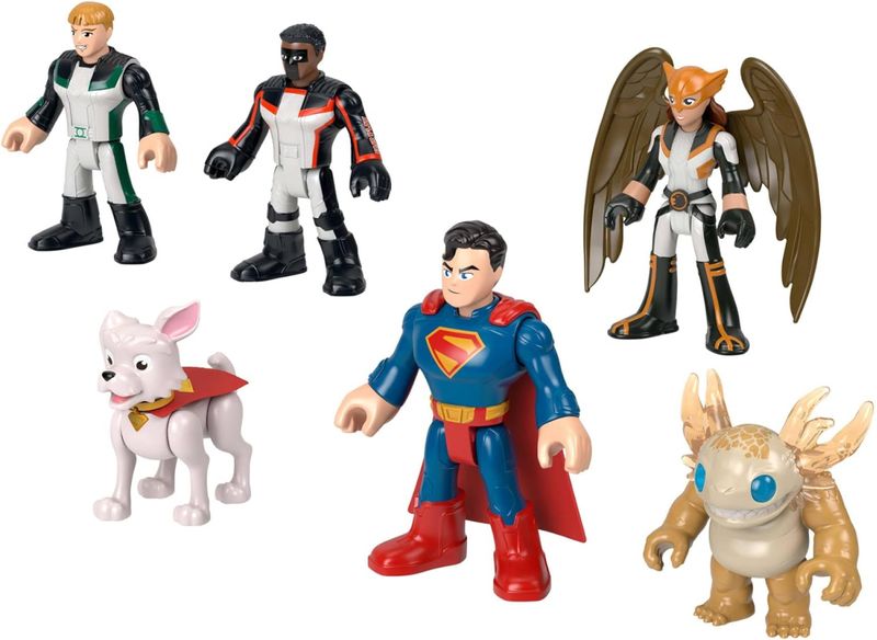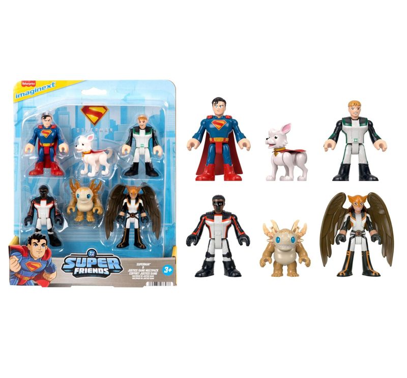 Multipack Superman Filme Marca: Fisher-Price (Mattel) Coleção: Imaginext - DC Super Friends. Contem: 6 Bonecos. Tamanho dos Bonecos: 5 a 7,5 cm de altura. Bonecos Articulados. - Dê vida à ação do Superman com este multipack de bonecos de ação Imaginext da Fisher-Price, contendo 5 super-heróis e um super-vilão juntos! - A coleção instantânea inclui Superman, Mulher-Gavião, Lanterna Verde, Sr. Incrível, Krytpo, o Supercão e o vilão Kaiju! - Os bonecos de super-heróis têm braços e pernas móveis, o que permite poses dinâmicas, e o plástico de alta qualidade é feito para suportar aventuras divertidas! - Fãs e colecionadores podem recriar a ação na tela e criar novas batalhas para jogar ou exibir com os super-heróis em seus trajes exclusivos! - Crianças de 3 anos ou mais vão adorar brincar de faz de conta e deixar a imaginação fluir em uma aventura de combate ao crime!