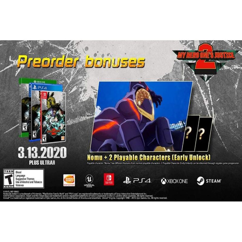 - Faça a sua encomenda agora e receba Nomu e 2 Personagens adicionais para desbloquear antecipadamente. Usuários com dados salvos no MHOJ1 podem desbloquear um item de personalização especial Izuku Midoriya (os desbloqueios Salvar dados não são multiplataforma) ITENS INCLUSOS: 1 - Jogo Original MY HERO ONE'S JUSTICE 2 - Xbox One