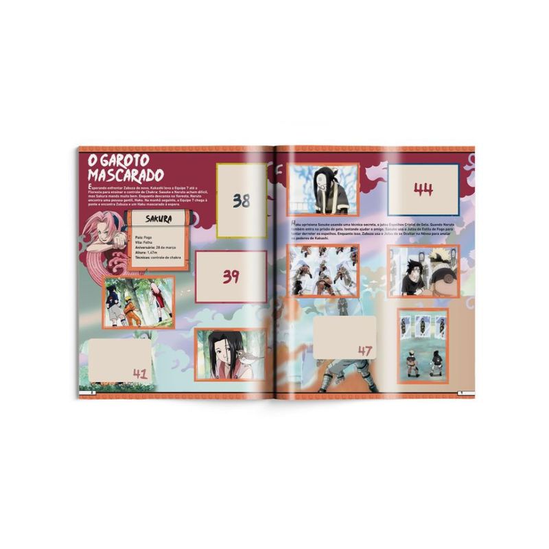 Toda a energia ninja em um álbum repleto de aventuras! Entre no mundo do Time 7 com o Livro ilustrado oficial “Naruto: Aventuras Ninja”! Reviva os maiores momentos do anime com 176 cromos para colecionar, incluindo especiais com efeito metalizado que brilham como os jutsus mais poderosos. Acompanhe Naruto, Sasuke e Sakura em sua jornada para se tornarem ninjas lendários. Troque figurinhas, complete seu álbum e mostre que você também tem espírito de combate.