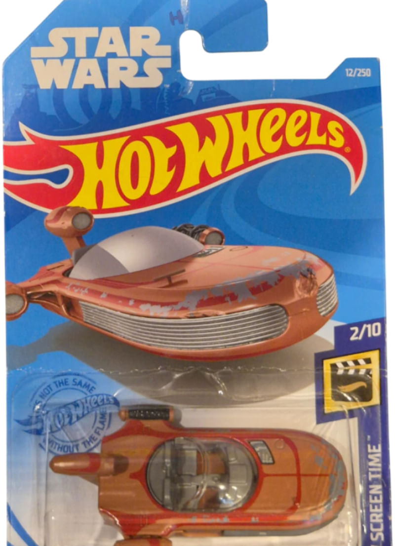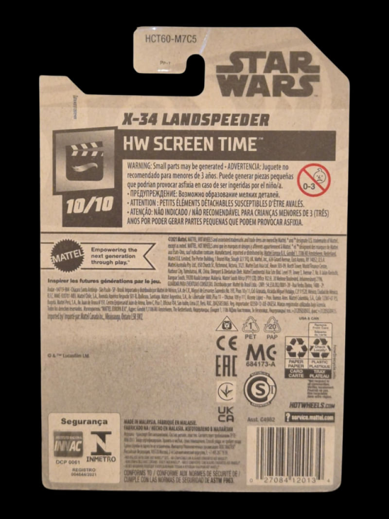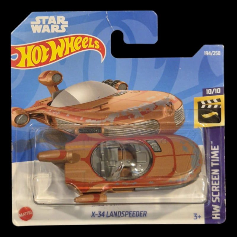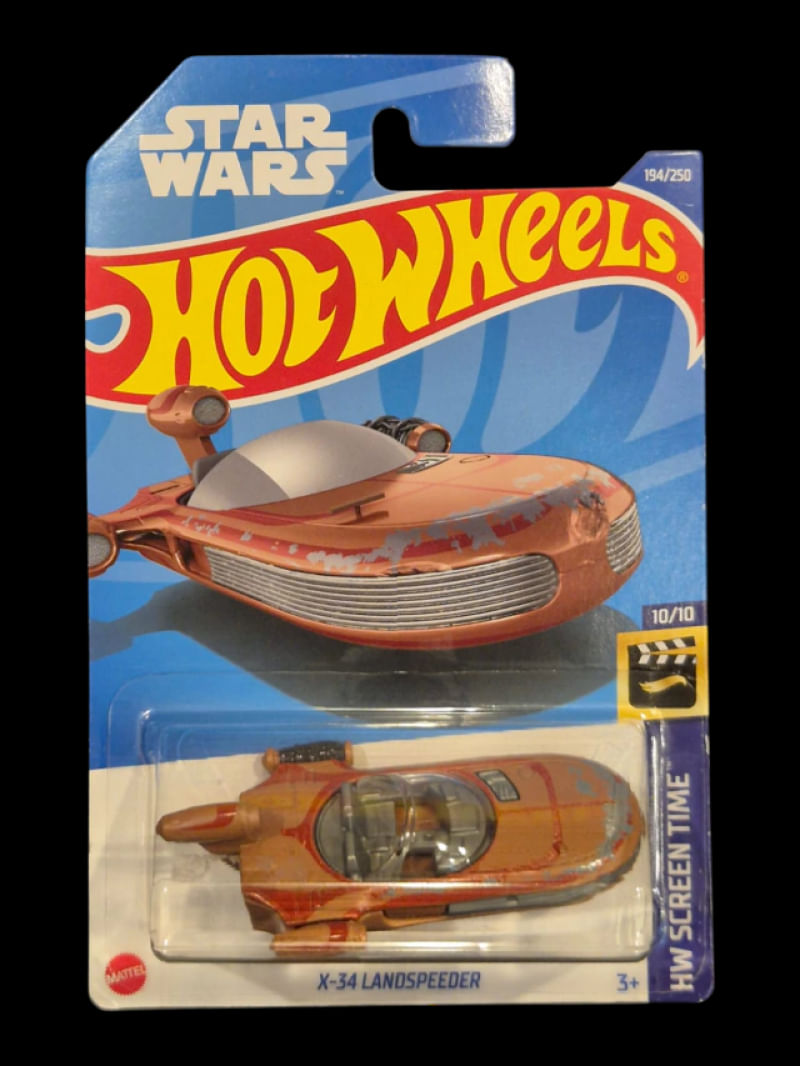 A nave Hot Wheels X-34 Landspeeder de Star Wars é uma miniatura do veículo pilotado por Luke Skywalker em Tatooine, no filme "Uma Nova Esperança". Lançada em 2021 pela Hot Wheels, faz parte da coleção "Screen Time" e é feita principalmente de metal (base) e plástico (para-brisa e detalhes) na escala 1:64, com rodas que giram. A miniatura possui acabamento fosco com detalhes que simulam o desgaste e as turbinas traseiras para dar a impressão de um veículo funcional. Origem e Contexto: A nave real é um veículo de apoio usado por fazendeiros como Luke Skywalker, que o utiliza para se locomover pelo planeta desértico de Tatooine, no início de Star Wars: Episódio IV - Uma Nova Esperança. Características da Miniatura: Escala: 1:64. Material: Carroceria de metal, com outros componentes de plástico. Design: Pintura fosca marrom clara (cobre fosco), com detalhes que simulam desgaste, como arranhões e sujeira. Rodas: Possui rodas que giram para simular o movimento. Interior: O painel inclui um volante do lado direito e dois assentos. Coleção: Esta versão faz parte da linha "Hot Wheels Screen Time" lançada em 2021 e licenciada pela Lucasfilm. Produção: A miniatura é produzida pela Hot Wheels, uma marca da Mattel. ATENÇÃO: Alguns modelos são de coleção antiga e as embalagens podem apresentar amarelamento, desgaste ou sujidade. ESCALA 1:64 LOTE: 2014 a 2026 ORIGINAL HOT WHEELS MATERIAL: METAL E PLÁSTICO FABRICANTE: MATTEL ARTIGO NÚMERO C4982 LINHA BÁSICA PODENDO SER TH (treasure Hunt - especificado no título) SKU: Especificado no título Hot Wheels é uma marca de miniaturas de carros de brinquedo, criada em 1968 pela fabricante americana Mattel. Originalmente destinada a crianças, a marca se tornou um ícone global, popular tanto entre crianças que brincam quanto entre colecionadores adultos. As miniaturas se destacam pelo design, desempenho e pela variedade de modelos, que incluem réplicas de carros reais e veículos originais.