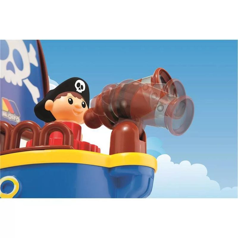 Ainda conta com 30 blocos de montar e 1 boneco Pirata. Tem rodinhas que auxiliam a brincadeira, rampa de carga para guardar os acessórios e uma cartela de adesivos para estimular a imaginação. As crianças vão adorar!