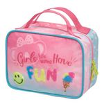 NECESSAIRE ESTOJO PACIFIC LOV IT LILICA RIPILICA HAVE FUN Coleção confeccionada em poliéster com estampa degradê em transfer. Patches de paetês e log em silkscreen de glíter. Puxadores de zíper em metal colorido e etiquetas personalizadas. Características Principais: Dimensões: 16 x 21 x 8 (LxPxA). Volume: 2,7 Litros. Garantia contra defeitos de fabricação