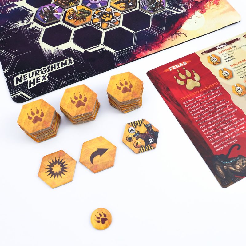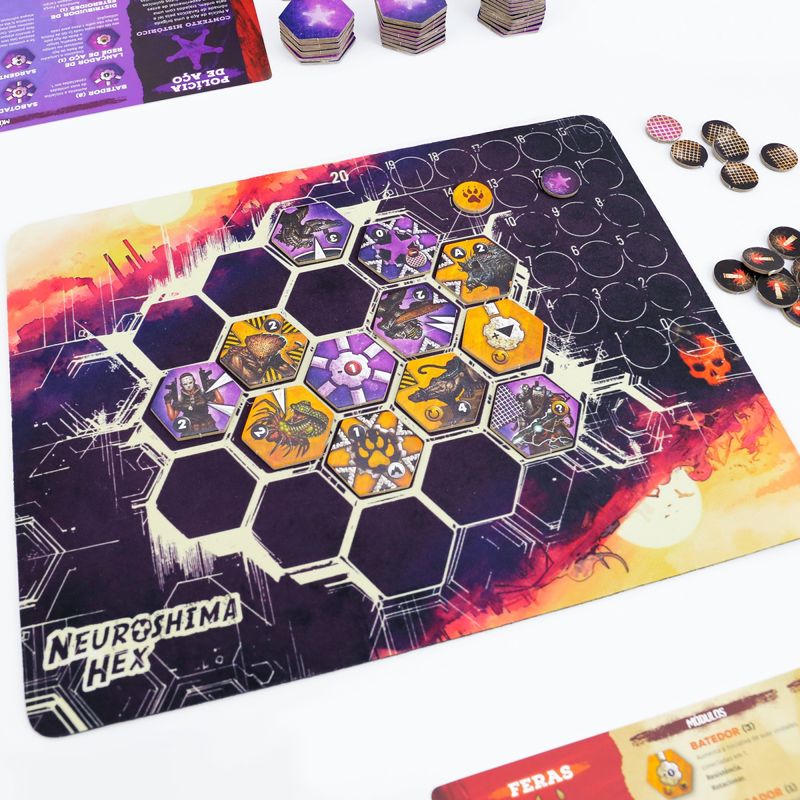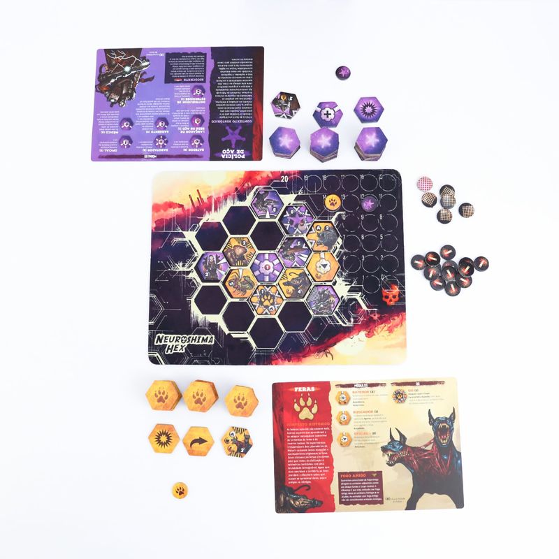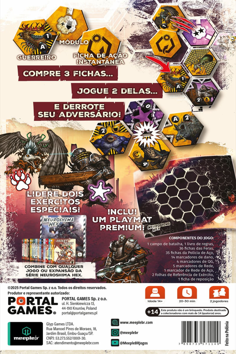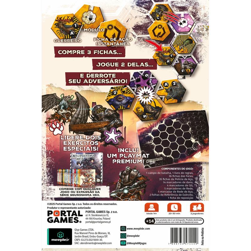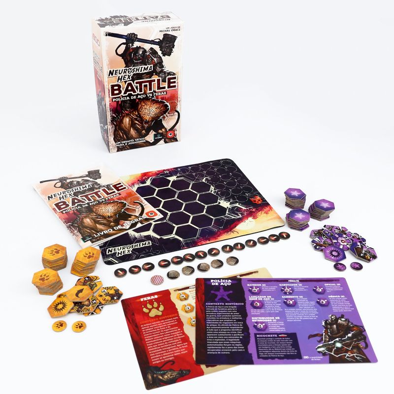 Neuroshima Hex: Battle – Polícia de Aço vs Feras é um jogo de estratégia tática para duas pessoas, que combina emoções intensas e uma temática futurista pós-apocalíptica, com desafios inteligentes e muitas reviravoltas. Cada partida apresenta uma disputa acirrada entre as facções Polícia de Aço e Feras, onde os jogadores buscam derrotar o QG do seu oponente.