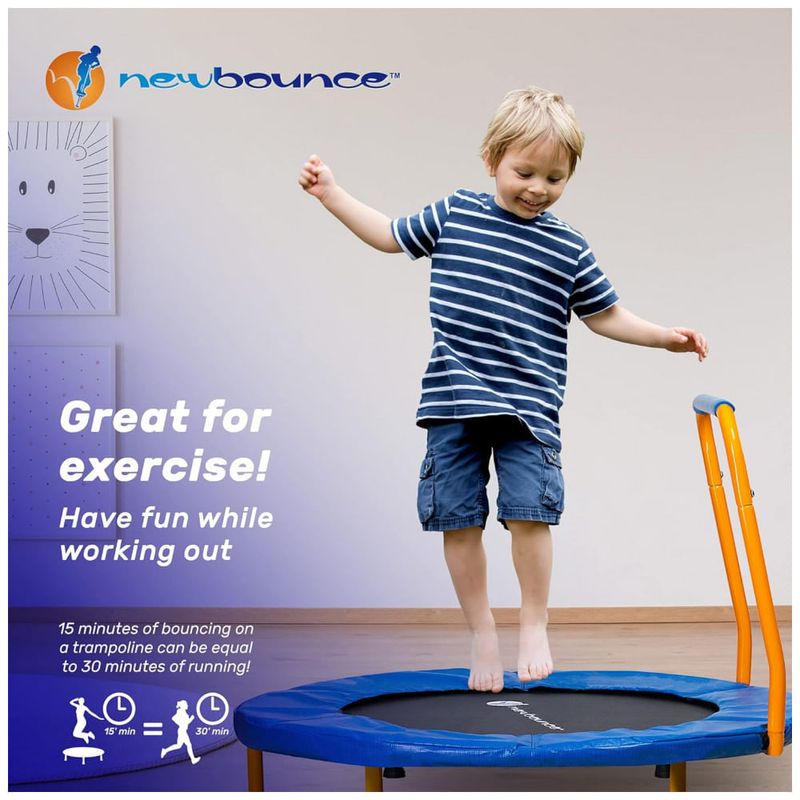 E FÁCIL DE USAR O trampolim é projetado com pernas resistentes e antiderrapantes e um tecido de alta densidade. As bandas de tensão vêm com um acolchoamento azul de proteção para proteção e segurança extra. O trampolim vem com um guidão laranja de para facilitar o equilíbrio para iniciantes.