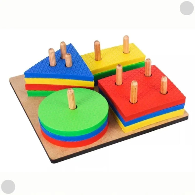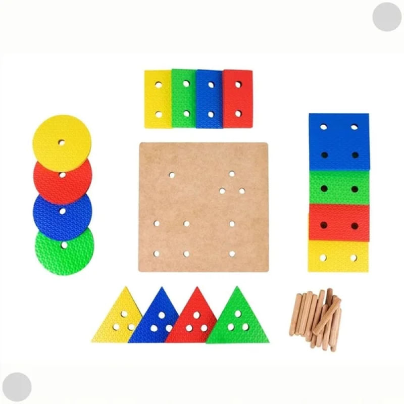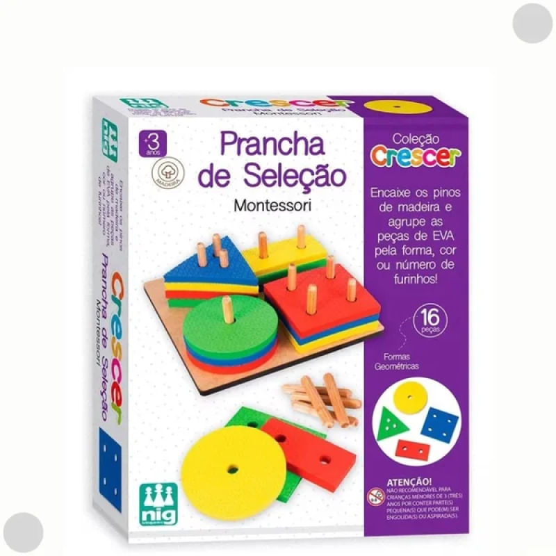 Nig Brinquedos Madeira Crescer Prancha de Seleção 16 Peças - Para os pequenos que estão na fase de explorar e conhecer os seus sentidos, a prancha de seleção é uma excelente opção, trabalhando e desenvolvendo a coordenação motora, tato, noções de quantidade, igualdade e montagem, explorando as cores, formas e tamanhos, os pequenos irão se divertir tentando encaixar as peças nas hastes. Este jogo educativo é todo feito em madeira e vem com 16 peças geométricas coloridas para as crianças encaixarem as peças de acordo com sua respectiva coluna e hastes de quantidade. Trabalha a coordenação com as duas mãos, a coordenação motora fina (montagem e encaixe), a noção de ordem e associação da simbologia de cada forma geométrica. Além de trabalhar coordenação motora, nomeação das cores e quantidades, também irá desenvolver concentração e atenção, onde a criança movimentará as peças corretas para encaixarem em cada haste que possui pinos diferentes. Características Gerais do Produto: Acompanha o produto: 1 base em madeira 15 pinos em madeira 16 peças geométricas em eva 1 regra