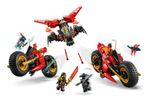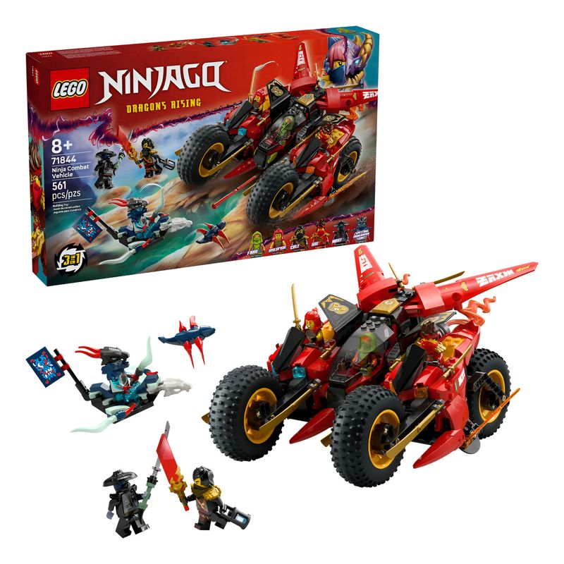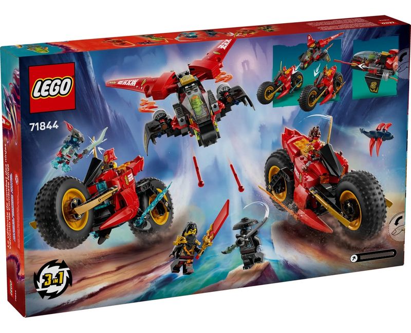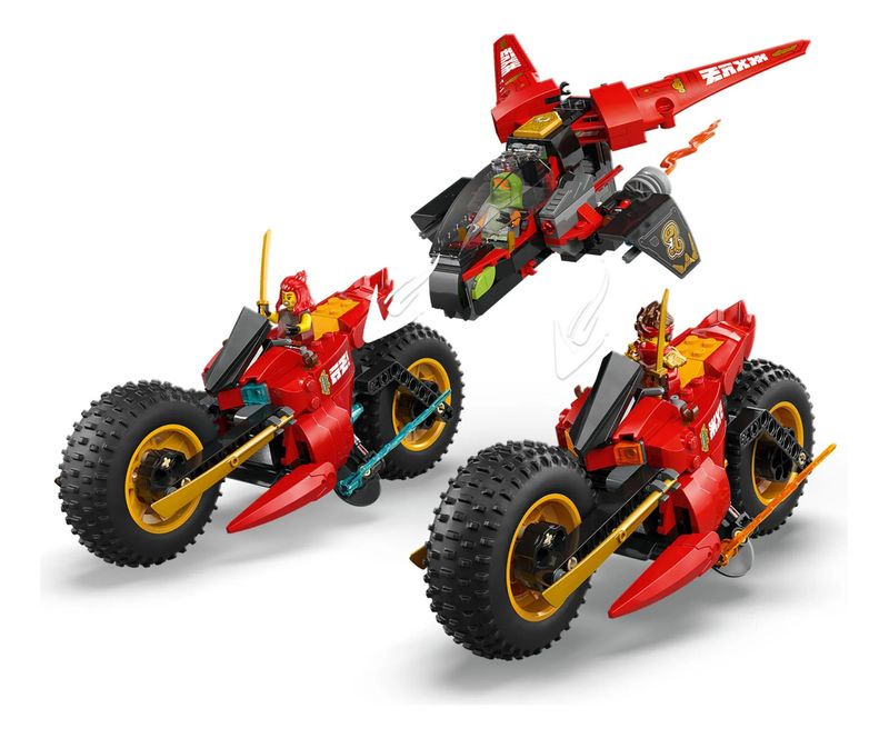 Crianças a partir de 8 anos encenam cenas da 3ª temporada da série de TV NINJAGO® Dragons Rising com o brinquedo de ação Veículo de Combate Ninja 3 em 1 (71844). As crianças podem brincar com uma grande moto ninja antes de dividi-la em 3 veículos menores: a moto do Kai, a moto do Wyldfyre e o avião a jato do Frak com 2 atiradores de pinos.