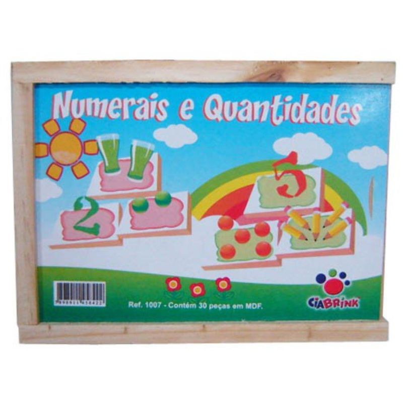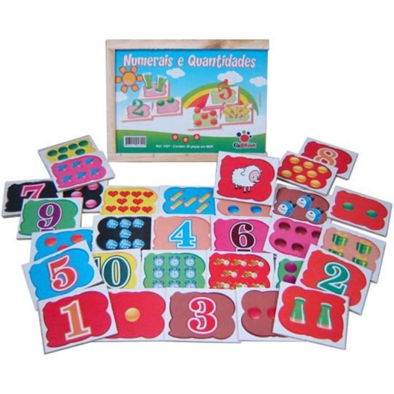 Contém 30 peças em MDF de 7 x 7cm cada. São 10 peças com os números, 10 peças com os pontos que representam os números e 10 peças com as quantidades referentes aos números. Estimula o aprendizado dos números e quantidades.