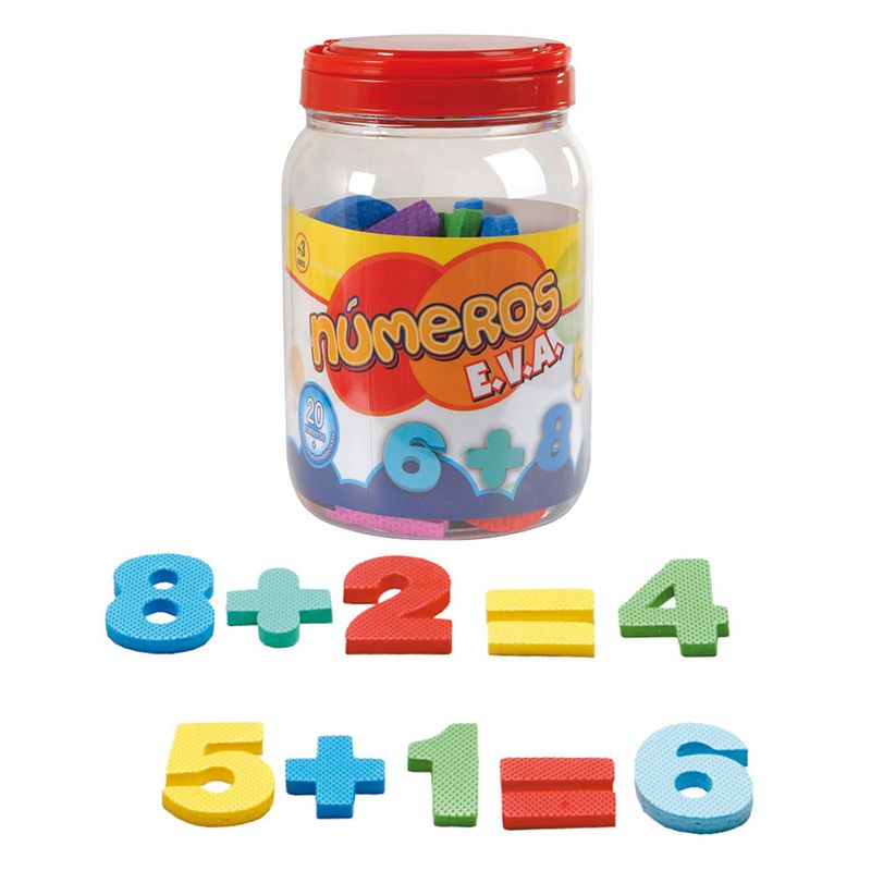 Contém 2 jogos de números de 0 a 9, mais os sinais das operações matemáticas, em e.v.a. colorido, medindo 7 mm de espessura.