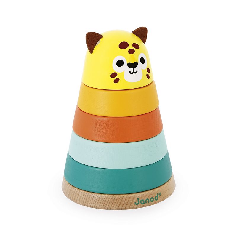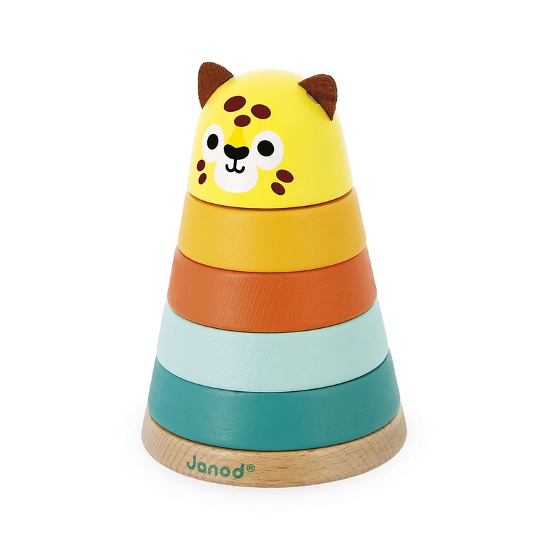 Uma onça colorida! Este lindo brinquedo empilhável de madeira mergulhará o bebê no coração da floresta tropical, onde ele se familiarizará com as cores enquanto se diverte. Ideal para desenvolver a motricidade fina das crianças a partir dos 12 meses, este empilhável é composto por 5 peças que o bebé pode empilhar ao seu próprio ritmo graças às cores presentes na haste central para o guiar! Um brinquedo de madeira 2 em 1 que manterá o bebê entretido por horas! Com as suas orelhas de feltro macio, esta pequena onça será o companheiro ideal para os mais pequenos, e dará um toque de cor ao seu quarto. Feito de tinta à base de água.