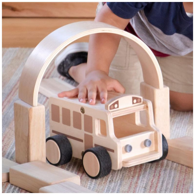 O Guidecraft Wooden School Bus é um veículo grande em madeira multilaminada de bétula, com ilustrações serigrafadas em tons naturais, desenvolvido para complementar atividades de blocos e brincadeiras de faz de conta com tema de cidade e transporte escolar. As rodas em plástico macio com superfície antiderrapante permitem que o ônibus deslize com estabilidade em pisos e tapetes, mantendo boa aderência durante o uso por crianças pequenas.?